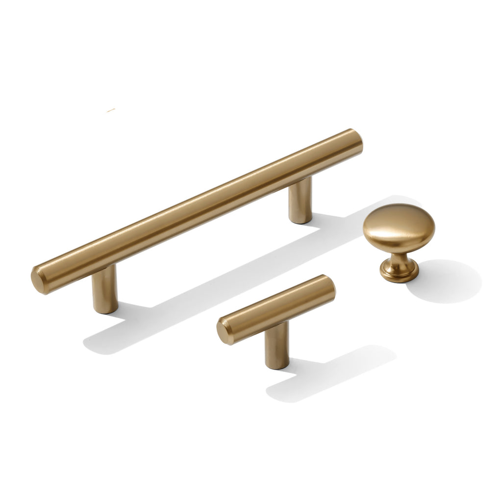 These beautiful champagne bronze t-bar drawer pulls and matching knob will dress up any space and make it look modern and chic.They are also great company to your champagne bronze faucet. The items are solid (not hollow).